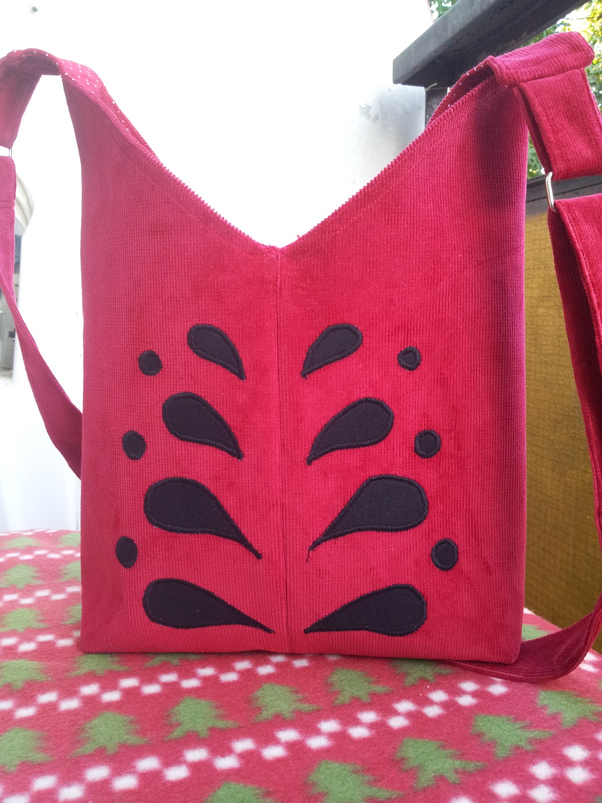 Ne tévesszen meg senkit, a táska nincs elszabva... csupán nyitott szájjal (mármint nem az én szám volt nyitva, hanem a tásé :o))) kissé felülről fotóztam, hogy együtt látszódjék a őszi-vörös kord és a táska béléséül szolgáló csodálatos színű pamutvászon: